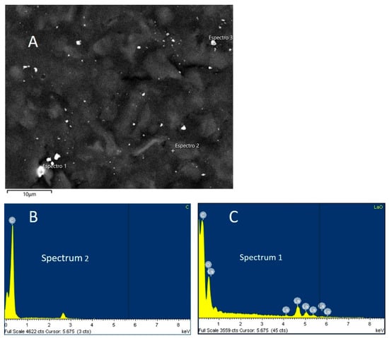 SEM results for LaOX/CPE are shown in Figure 3A. Small white crystals of varying sizes are clearly visible and evenly distributed over the carbon surface. One of the crystals (spectrum 1) was measured by EDS to calculate its composition, which is shown in Figure 3C. The EDS analysis of the CPE (Figure 3B) shows the presence of C without oxygen, and the EDS image of the LaOX/CPE microstructure (Figure 3A) shows the presence of C, La, and O. Furthermore, the percentage weight ratio of O/La given by the EDS analysis (Figure 3C) is 0.18. The theoretical value is 0.17 for La2O3. This confirms the presence of only La (III) on the surface of the modified electrode.