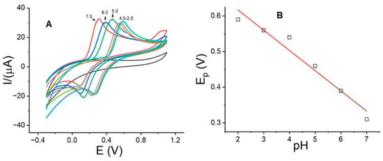 (A) Cyclic voltammograms of DP using LaOX/CPE in PB with pH between 2.0 and 7.0 and (B) plot of Ep(V) vs. pH. Experimental conditions: DP, 0.25 mmol/L; scan rate, 0.1 V/s.