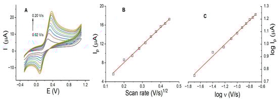 (A) Cyclic voltammograms of DP using LaOX/CPE, (B) plot of Ip (µA) vs. ʋ1/2 (V/s), and (C) plot of log Ip (µA) vs. log ʋ (V/s). Experimental conditions: DP, 0.25 mmol/L; scan rate, 0.02–0.20 V/s; pH 7.0 in PB.