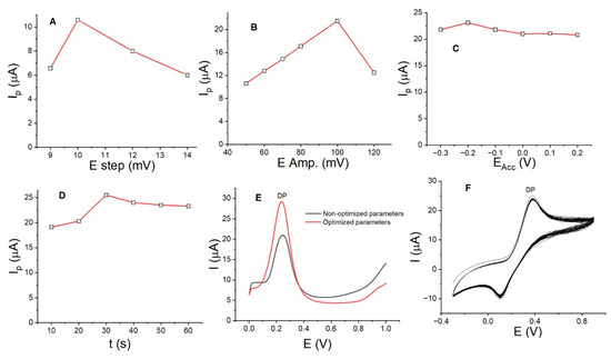 With the aim of increasing the DP anodic peak current using LaOX/CPE and achieving a low detection limit and good sensitivity, other parameters were investigated. We evaluated the accumulation potential (EACC) and accumulation time (tACC) during the accumulation stage, as well as the amplitude potential in mV (EAMP) and step potential (EStep) during the stripping stage by SWV. The measurements were conducted using the univariate method, where only one parameter was varied at a time. Parameters such as the frequency (Hz) were not considered, as no significant variation in the DP anodic peak currents was observed between 10 and 50 Hz. The plots of Ip (µA) versus EStep (Figure 6A), EAMP (Figure 6B), EACC (Figure 6C), and tACC (Figure 6D) demonstrate a proportional increase in the anodic peak current for DP at 0.04 mmol/L. The current increased from 6.5 to 10.0 µA with an EStep of 10.0 mV, from 10.0 to 20.0 µA with an EAMP of 100.0 mV, from 20.0 to 22.5 µA with an EACC of −0.20 V, and from 22.0 to 25.0 µA with a tACC of 30.0 s. Figure 6E shows the DP anodic peak currents with non-optimized parameters (black curve) and optimized parameters: EStep of 10.0 mV, EAPM of 100.0 mV, EACC of −0.20 V, tACC of 30.0 s, and pH of 7.0 PB. It is clear that the current increased by almost 100% without a change in the DP oxidation potential value. This improvement allows for a lower detection limit to be achieved.