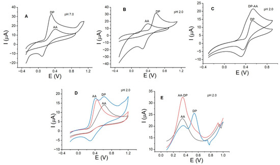 Cyclic voltammograms illustrating DP and AA concentrations of 0.25 µmol/L at (A) pH 7.0 and (B) pH 2.0, and (C) cyclic voltammograms depicting simultaneous DP-AA detection at pH 2.0. The impact of CTAB on the anodic peak currents for AA and DP is demonstrated by (D) cyclic voltammetry and (E) square wave voltammetry, with AA shown in black curves, AA with CTBA in red curves, and DP-AA with CTAB in blue curves. The experimental conditions are similar to those in Figure 7.