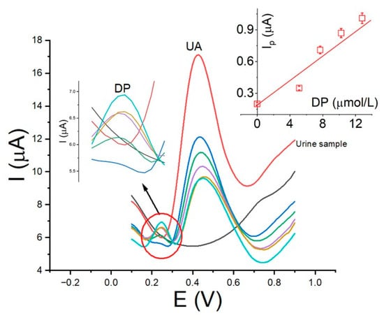 The human urine used to evaluate the accuracy of DP detection was donated by a laboratory collaborator. The real sample was spiked and did not require prior treatment before analysis. Only 1.0 or 2.0 mL of the sample was used. This amount was necessary to obtain a more complex matrix and evaluate the interference of uric acid and metal cations present in urine.