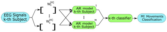 Firstly, in the training stage, the data were whitened, as recommended in [17], for each subject, separately. The EEG signal collected from each subject was considered to be one dataset. IVA was applied in the training data for each class separately to obtain the matrices that correspond to the extraction of the main features for the c-th class and k-th subject, with for DS4a, and . This procedure is presented in Figure 1. Then, considering the k-th subject, the estimated SCV components were obtained by multiplying the training and validation data by each class matrix and , followed by each corresponding whitening matrix and , resulting in and , as shown in Algorithm 1. Using both matrices at this point is necessary considering that validation and test data are assumed to be completely unknown. The choice of obtaining IVA matrices for each class can leverage the feature extraction process, leading to a possible classification improvement. Subsequently, and were stacked and AR modeling was applied to each extracted feature (corresponding to each EEG channel) in order to reduce and adjust the data dimension. The resulting AR parameters were used as the classifier inputs. Finally, the data of each subject were classified according to the two considered classes. This second step is exemplified in Figure 2.