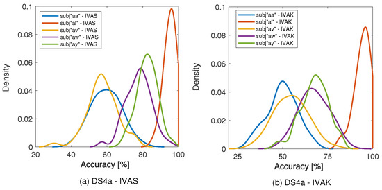 In Section 4.2, we described the IVA matrix selection methodology, which is grounded on a random IVA initialization search. Concerning the number of initialization iterations, for the sake of computational efficiency and based on pre-analysis, 100 iterations were used to select the appropriate . In that sense, IVA was randomly initialized 100 times using a Gaussian distribution with zero mean and unit variance, and for each initialization, accuracy was computed based on the parameters of the classifiers and validation dataset, and considering the same IVA matrix initialization for all subjects. Figure 3 shows the kernel density estimation (KDE) for DS4a and two algorithms: IVAS and IVAK. In both cases, it is possible to verify the occurrence of an initialization that maximizes accuracy, even if it may be a rare event. In Figure 3a, the subjects “aw” and “ay” show a longer tail and similar pattern, finding initializations with accuracies over , and the subject “al” has the highest accuracy probability. On the other hand, in Figure 3b, for instance, three out of five subjects present a greater likelihood for accuracy around , while the curves obtained for subjects “aa” and “av” present a mean achieved accuracy lower than the one obtained by the other subjects, showing a probable higher classification complexity.