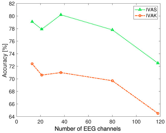 Another interesting analysis is to investigate the algorithm’s performance with respect to the number of EEG channels used as each IVA dataset input. Considering that DS4a EEG signals have 118 channels, the number of channels was analyzed using 13, 21, 37, 80, and 118. To reduce the number of channels, those located in brain regions known for higher activity during motor imagery tasks were chosen [40]. The results are shown in Figure 4. The results show that using all the available channels leads to a decrease in performance. The best results for DS4a were obtained by IVAS, with 37 EEG channels (FAF5, FAF1, FAF2, FAF6, F7, F5, F3, F1, Fz, F2, F4, F6, F8, FFC7, FFC5, FFC1, FFC2, FFC4, FFC6, FFC8, FT9, FT7, FC3, FC1, FCz, FC2, FC4, FC6, FT8, FT10, CFC7, CFC5, CFC3, CFC1, CFC2, CFC4, CFC6). Ideally, as the number of channels increases, more information is available. However, we hypothesize that the amount of noise also increases and could prejudice the feature extraction process. Among the algorithms tested, SVM was the one that performed better. In this case, the IVAK algorithm presented the lowest performance when the number of EEG channels was the maximum 118 channels.