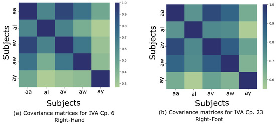 In Section 2.1, we mentioned the SCVs and how they are extracted through IVA. In this section, we present the relation between the results achieved from SCV covariance matrices, obtained through the use of the estimated sources , and the DS4a cross-subjects. Figure 5 shows two SCV covariance matrix examples extracted from IVA components (IVA Cp.). These results are based on the use of 37 channels, which achieved the best outcome in the previous analysis. In Figure 5a, we present the covariance matrix obtained from the SCVs for the right hand movement and IVA component 6 as an example. As can be seen, two cases present a higher cross-correlation: “aa” with “av”, which achieves a value of 0.909; and “aa” with “aw” which achieves 0.708. The second example is based on the right foot movement and IVA component 23, shown in Figure 5b, where the highest correlation of 0.936 was achieved also among subjects “aa” and “av”, but other relevant correlations were reached between subjects “av” and “aw”, with a value of 0.887, and subjects “al” and “aw” with a value of 0.749.