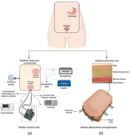 An illustration of the abdominal compartment and abdominal wall of the phantom. (a) Two sub-compartments were placed inside the modeled abdominal compartment to represent the bladder and stomach. Two intra-bladder and two intra-gastric pressure measurement instruments were connected to the abdominal compartment as well. (b) An artificial abdominal wall including skin, fat, muscle, and peritoneum was placed on top of the abdominal compartment. By connecting the abdominal wall to the ground surface by extension springs, the abdominal compliance can be adjusted further.