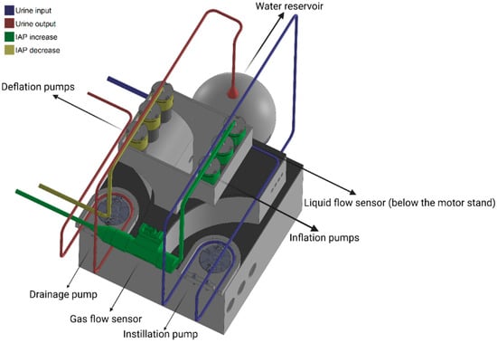 The electronic circuit was designed using Altium PCB design software (Altium Inc. San Diego, CA, USA) and printed by JLCPCB (JLCPCB Co., Shenzhen, China). The electronic circuit and the printed circuit board (PCB) are presented in ESM Figure S1. Vacuum pumps (Adafruit Industries, New York, NY, USA) were used to inflate/deflate the abdominal compartment and increase/decrease the IAP by gas instillation. This mechanism of IAP elevation and reduction represents the original pathology behind IAP elevation. The gas employed to inflate or deflate the abdominal compartment was regular air. The output of the pumps was connected to a thermal gas flow sensor (Honeywell Inc., Charlotte, NC, USA) to monitor the gas volume instilled inside the abdominal compartment. This sensor is crucial to record intra-abdominal volume changes (ΔIAV). A pressure transducer (Panasonic Industry Europe GmbH., Hamburg, Germany) was also used to measure IAP for the settings of Ventra. The pressure transducer was zeroed with respect to the IBP catheter’s tip height level to prevent any bias due to the water height difference between the IBP catheter’s tip and the pressure transducer. Since the catheter sensor balloons are air-charged, the height of the catheter’s tip and pressure transducer within the abdominal compartment do not make any difference to IAP readings. Therefore, all the IAP recordings are assumed to represent the IAP at the mid-axillary line at the iliac crest level (in compliance with the current gold standard [24]). Two peristaltic pumps were also used to instill and remove fluid to and from the modeled bladder. The fluid utilized to replicate the bladder fill volume and urine output was distilled water. The output of the fluid pumps was also connected to a turbine fluid flow sensor (Honeywell Inc., Charlotte, NC, USA) to monitor the fluid volume being inserted into the bladder, which resembles the urine input volume. Using the information from pressure and flow (gas and liquid) sensors, and a microcontroller (Arduino Inc., Somerville, MA, USA), the phantom was programmed and controlled. Lastly, a computer-aided design (CAD) of the enclosure for the components was designed in SolidWorks (SolidWorks Corp., Waltham, MA, USA) and 3D printed by Prusa printers (Prusa research, Prague, Czech Republic). The final assembly is shown in Figure 2.