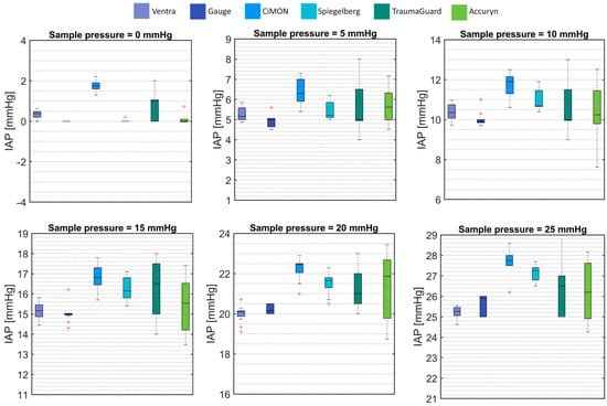 The mean and standard deviation of the IAP measurements at 0, 5, 10, 15, 20, and 25 mmHg. The error bars are the 95% confidence interval, the bottom and top of the box are the 25th and 75th percentiles, respectively, the line inside the box is the 50th percentile (median), and any outliers are shown in red.