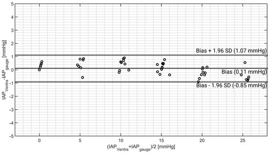Bland–Altman results of the simulated IAP. Ventra showed a slight bias of +0.11 mmHg when compared with the pressure gauge.