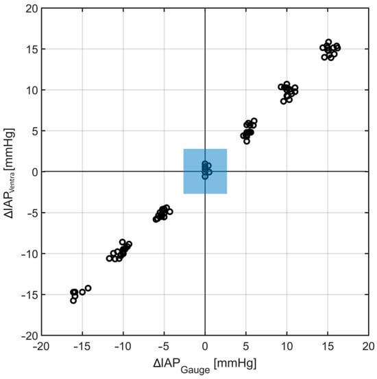 The concordance analysis result. A concordance coefficient of 100% was observed for Ventra, which shows the capability of this abdominal phantom in tracking IAP changes (the blue region indicated the excluded data).
