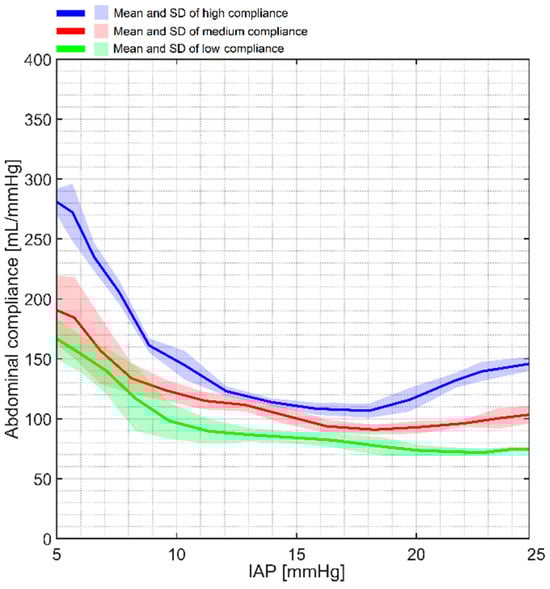 Compliance maneuver of the phantom at high-, medium-, and low-compliance conditions. A relatively high compliance can be observed at IAP values lower than 10 mmHg. However, at IAPs higher than 10 mmHg, the impact of the springs becomes more dominant, which results in reduced compliance.