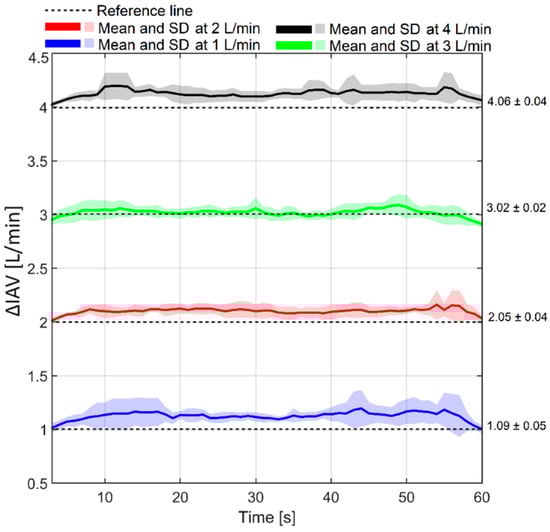 Mean and standard deviation of ΔIAV recorded by the gas flow sensor. The measurements at four different flow rates are compared with the reference measurements by an analog flow meter.