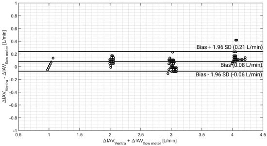 On average, a bias of 0.08 ± 0.07 L/min was observed between the recorded ΔIAV by the gas flow sensor and the reference flow meter. The Bland–Altman results for ΔIAV are shown in Figure 10.