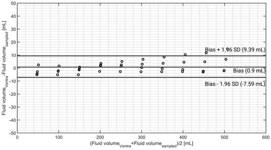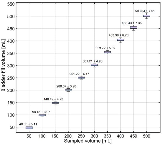 The results show a slight underestimation of the bladder fill volume for fluid volumes smaller than 200 mL. However, at volumes higher than 200 mL, a slight overestimation can be observed in the results. The Bland–Altman results of the bladder fill volume are presented in Figure 12.