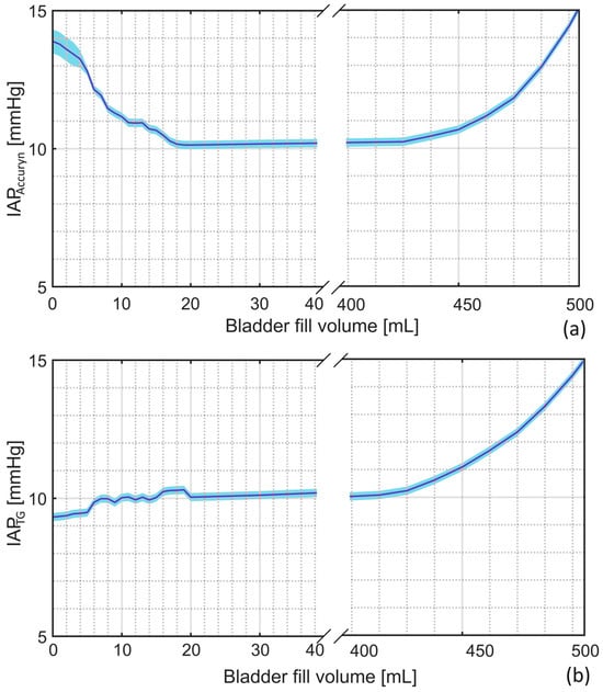 The IAP measurements by the (a) Accuryn and (b) TraumaGuard catheters in Ventra at different bladder fill volumes.