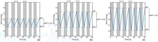 Dynamic IAP changes due to respiration with I:E set at 1:1. IAP changes due to respiration with an abdominal pressure variation of (a) 10%, (b) 20%, and (c) 30%. The end-inspiration (IAPei), end-expiration IAP (IAPee), and ΔIAP are illustrated as well.