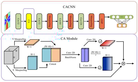 Many excellent CNNs have emerged in the evolution of network structures. Among these classic networks such as LeNet-5, VGG, GoogLeNet, ResNet, etc., the VGG networks are widely used in image recognition due to their concise structure, small convolutional kernels, small pooling kernels, multiple channels, and feature maps with deeper and wider layers []. Each convolution layer uses a 3 × 3 convolution kernel. Based on this network, a coordinate attention (CA) module can help the model better locate and focus on important features. This is added to the CNN to form a CACNN. The network structure is shown in Figure 1.