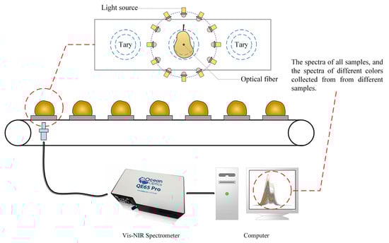 Yali pear browning is a kind of pear heart disease caused by changes in temperature and a long time during storage and transportation. The Yali pear samples were collected from an orchard (LingGuo, Handan, Hebei, China) in Hebei Province, China. After picking, they were transported to the laboratory through cold chain transportation. Before the experiment, these samples were stored at a constant temperature for 24 h, which can reduce the influence of temperature on spectral acquisition []. The pears selected for the experiment were about 65–75 mm in diameter, and the skin had no noticeable discoloration or damage. The Vis-NIR spectra of the samples were collected by an Ocean Optics INC, QE-65Pro (Dunedin, FL, USA) high-precision spectrometer. The samples were placed on a tray and sequentially entered the light shield on a conveyor belt for the spectral collection. The spectral acquisition system is shown in Figure 2. The collected signal was the light intensity measured by the sensor after the light source had transmitted through the sample, and the background spectrum was automatically subtracted from the instrument. After the spectra collection, the samples were cut one-by-one along the center line, and three experienced agricultural experts judged whether browning occurred. A total of 495 pear samples were collected, and the spectral collection range was 370–1160 nm, with a total of 1024 data points, including 256 healthy pears and 239 browning pears. The random sampling method was used to divide the training set and the test set at a ratio of 2:1.