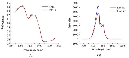 The average spectra of the two categories of wheat kernels are shown in Figure 4a. The difference between the average spectra of the two categories of samples in the 870–1100 nm and 1200–1400 nm bands is significant. The absorbance peaks of different bands in the following wavelengths are most noteworthy: the 965–985 nm N-H stretching second overtone band associated with proteins; the 1130–1200 nm second overtone of C-H stretching, which is related to carbohydrates; 1330–1385 nm, a combination of C-H stretching and C-H deformation [].
