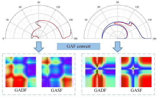 GAF is a coding method for converting 1D signals to 2D images [] that can retain the mutual difference or sum information of the original 1D signals. The specific calculation process is as follows.