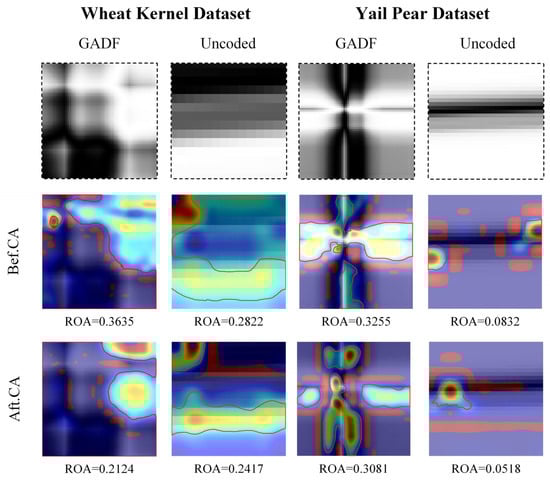 For the wheat kernel dataset, the ROA of the G-CNN network decreased from 0.3635 to 0.2124 after adding the CA module. For the Yali pear dataset, the ROA of the G-GACNN network decreased from 0.3255 to 0.3081 after adding the CA module. The G-CACNN pays more attention to the information regions.