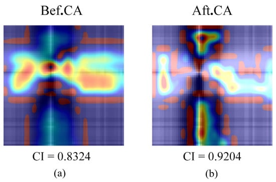 The confidence index (CI) is the basis on which networks are ultimately classified. The higher the CI, the greater the likelihood that the unknown sample belongs to the class. In the CACNN model, the CI is represented by the outputs of the final fully connected layer, which are transformed into a probability distribution after processing by the softmax function. Figure 8 illustrates the Grad-CAM and confidence index of the seventh healthy pear noise (SNR = 20) spectral encoding map modeled with the G-CNN and G-CACNN. Before using the CA module, the CI was 0.8324. The attention of the network was focused on a few points after adding the CA module and the CI increased to 0.9204. In image classification, the CA module encodes positional information and fuses it with feature variables. Through iterative training, the model will assign more significant weights to the feature variable locations. Consequently, this reduces the impact of non-essential areas on the identification results, thus improving the model’s accuracy.