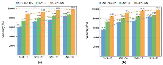As Figure 9 shows, with the improvement of the SNR, the prediction accuracies of the three types of models have different improvements. The PLS-DA is very sensitive to noise in the data, so the preprocessing method cannot eliminate the influence of spectral noise on its analysis results. Under the same level of noise conditions, PLS-DA always has the lowest prediction accuracy among the three models. In contrast, the EL model SNV-RF performs better, which demonstrates its robustness to noisy data. The result of the GADF-CACNN is better than the SNV-RF at all noise levels. For the wheat kernel dataset, the results are 88.64%, 92.42%, 96.21%, and 98.48%. For the pear dataset, they are 84.85%, 92.12%, 96.97%, and 98.79%. This means the method has good noise immunity and the best robustness when dealing with spectral data with additive noise. At the same time, from the perspective of the changing trend of accuracy, the effect of the change of the noise level on the DL model and the ensemble model is less than on the SL model, and the influence of the GADF-CACNN is the least, which is also an important feature to demonstrate the robust operation of the model.
