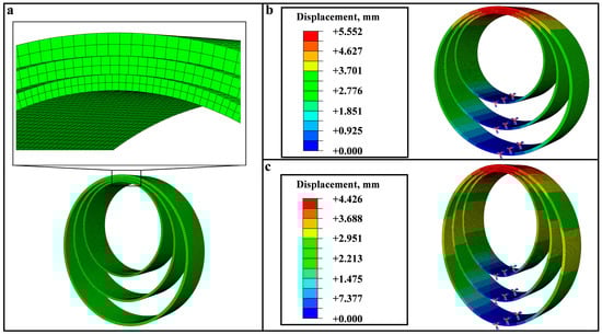 (a) FEM Meshes of the three rings model. Displacement nephogram of three flexible rings under (b) Fcompression of 20 N and (c) Ftensile of 20 N.