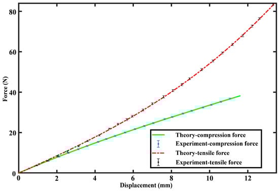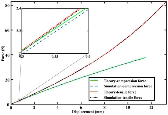 According to the simulation results, displacement nephograms for three rings under the loading force is extracted, and the results of the 20 N loading are shown in Figure 2b (Fcompression) and Figure 2c (Ftensile). According to nephograms, the rings’ top displacement ∆y is readily determined, and the force-displacement correlation is established by adjusting the loading force values during simulations. A comparison between the FEM simulation and theory is shown in Figure 3, where the theory is consistent with the FEM simulation. The maximal error between theory results and simulation within the measurement range is only 0.37%, proving that the proposed analytical model is precise.