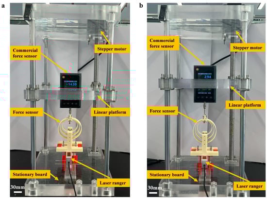 To assess the FS’s feasibility, experiments were conducted on the Fcompression (Figure 4a) and the Ftensile (Figure 4b), respectively. The experiment setup includes the proposed FS, a customized linear platform, a commercial FS, and a laser ranger. The base of the FS is securely fastened to the stationary board so that the sensor remains fixed during tests. The commercial FS (DAYSENSOR DY920-B, Dayang Sensing Enterprise, Bengbu, China) (measurement error 0.1%) is fixed to the linear platform, allowing it to move vertically with the linear platform. A stepper motor (AnChuan 86HD2440, YASKAWA Electric Corporation, Kita-Kyushu, Japan) drives the vertical motion of the linear platform, and it is controlled by a stepper controller (AnChuan CA-01, YASKAWA Electric Corporation, Kita-Kyushu, Japan) and a driver (AnChuan CA-4060, YASKAWA Electric Corporation, Kita-Kyushu, Japan).