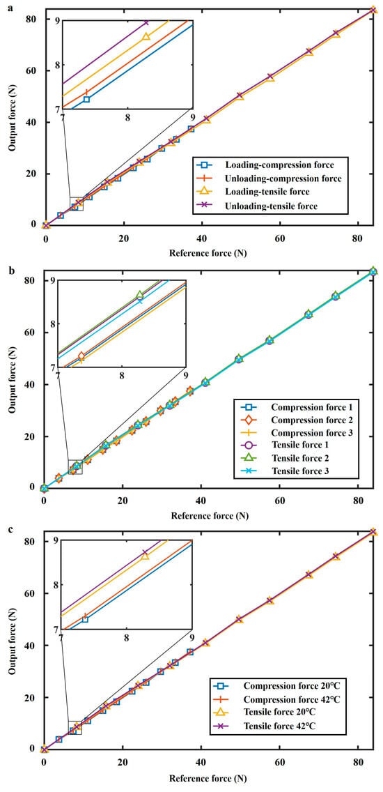 (a) Hysteresis test. (b) Repeatability test. (c) Temperature test. (42 °C and 20 °C).