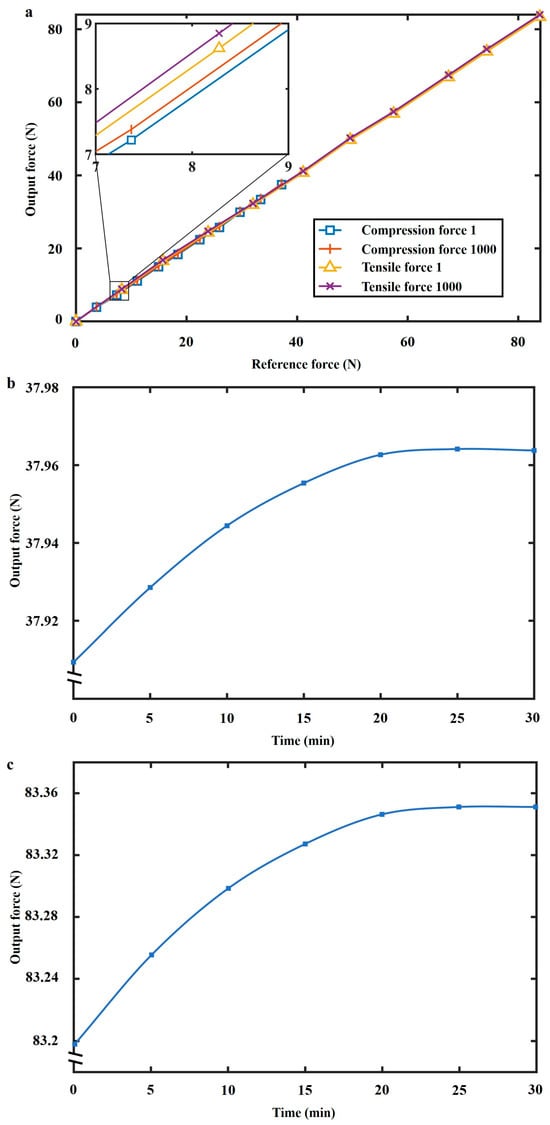 To present the comprehensive performance of the designed FS, we tested the hysteresis (loading–unloading), straightness, repeatability, temperature, cyclic, and creep errors of the sensor, as shown in Table 1. For the hysteresis test in Figure 6a, the mean of three loading-unloading experiments is used to calculate the hysteresis error. The sensor’s hysteresis error is possibly attributed to its flexible structure. According to the loading test result of the hysteresis test in Figure 6a, the sensor’s straightness error is calculated. The sensor’s repeatability error is tested by loading the external force three times (Figure 6b).