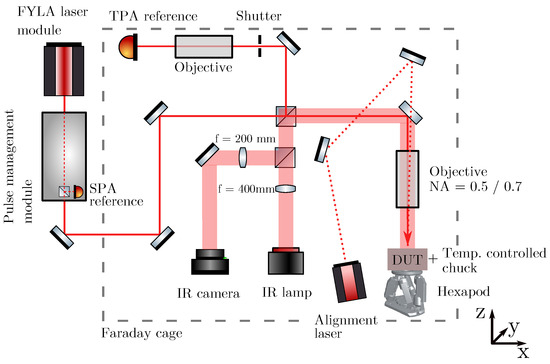 The DUTs are glued with silver epoxy to a printed circuit board (PCB), which establishes the electrical connection. The PCB is mounted below the objective to a copper chuck that is thermally coupled to a Peltier element, where the hot side of the Peltier element is cooled by a HUBER chiller. In order to lower the leakage current of the DUTs, the active cooling to is performed, and the Faraday cage is continuously flushed with dry air. The illumination is applied from the top side into the centre of the opening window of the device. The copper chuck is positioned on a six-axes Newport HXP50-MECA stage, which allows high-precision movement and rotation along all three-dimensional axes. The rotation is used to level the DUT and ensure an orthogonal incidence of the laser. The setup includes an infrared (IR) microscope, with an IR lamp and IR camera. The IR microscope is used to live picture the DUT below the objective and to find regions of interest. Further information about the setup can be found in reference [5].