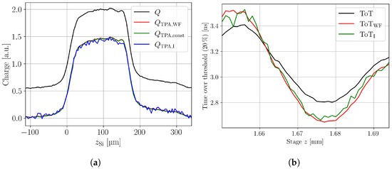 (a) Charge versus depth profile of an irradiated (3.32 × 1014 ) thick p-type planar pad detector. The bias voltage is . A comparison of the three different SPA correction methods is shown. The waveform subtraction method is indicated by the index WF, the subtraction method by the index const , and the correction by intensity method by the index I. The uncorrected data are given without index. (b) Time over threshold measurement in the same pad detector, including a comparison of the waveform subtraction and the intensity correction method.