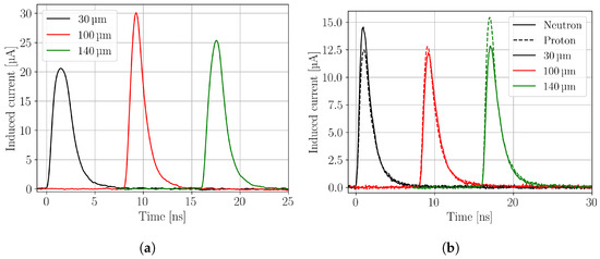 Measured current transients of an unirradiated, a neutron-, and a proton-irradiated sample are shown in Figure 3 for different depths (, and ) of the focal point in the active volume. The signals are shifted on the time axis for better readability.