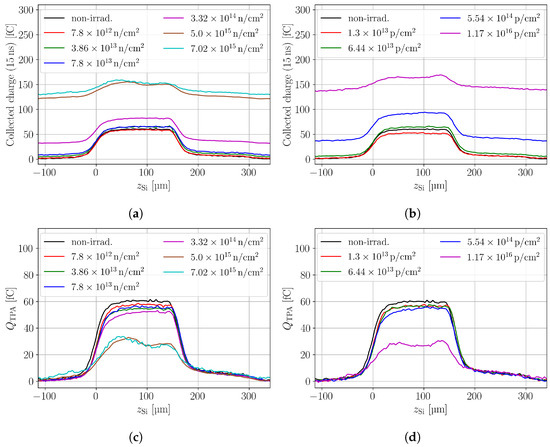 CC profiles of the neutron- and proton-irradiated samples are shown in Figure 4a,b, respectively. It can be seen that both lead to an SPA offset that increases with the fluence. Figure 4c,d show the SPA corrected in-depth scans, where the decreasing CC is evident. Further, it can be seen that increasing fluences lead to inhomogeneous CC profiles along the device depth. The inhomogeneity is linked to inhomogeneous electric fields and charge-carrier-dependent trapping. Depending on the excess charge deposition depth, electrons or holes need to drift a longer distance and face different low field regions, which is why their probability of trapping changes with the deposition depth.