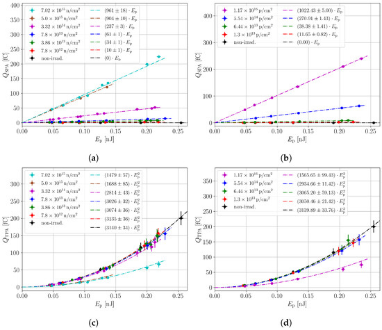 To parametrise the SPA background against the equivalent fluence, it is plotted in a log-log diagram, as shown in Figure 10. The SPA contribution follows for fluences a function . Higher fluences deviate from this behaviour, and it was measured that increasing bias voltages reduced the deviations, which is not shown in detail within this manuscript. This bias dependence indicates that the deviations are related to charge trapping that becomes apparent at the highest fluences.