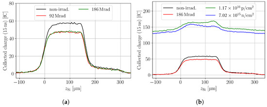 The gamma irradiation was performed with a 60Co source at IRB in Zagreb [19]. Two pad sensors irradiated to and are studied. In-depth CC scans are shown in Figure 7a, where a non-irradiated device is shown for comparison. It is observed that the gamma irradiation, in contrast to neutron and proton irradiation, does not introduce an SPA background. A comparison between the CC in neutron-, proton-, and gamma-irradiated devices can be seen in Figure 7b. The gamma-irradiated samples show a decrease in CC with respect to the non-irradiated device, which indicates that trapping is present. At both doses, a comparable amount of charge is collected, which is confusing as it indicates a saturation in charge loss at these doses. Such saturation is not expected from the bulk leakage current measurements of the two devices which differed by a factor of about two. Also data on gamma-irradiated p-type sensors in the literature do not show a saturation effect for damage parameters like leakage current and depletion voltage in the dose range studied here [24]. Irrespective of this unresolved observation, it can be stated that the charge loss is constant throughout the two devices, contrary to the neutron- and proton-irradiated devices. Hence, the trapping is equal for all excess charge deposition positions, which suggests that the trapping cross-section of electrons and holes is approximately the same in the gamma-irradiated samples.