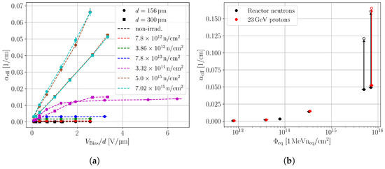 (a) Effective linear absorption coefficient of neutron-irradiated pad detectors versus the bias voltage, which is normalised with the device thickness. (b) Effective linear absorption coefficient for thick neutron- and proton-irradiated pad detectors versus the equivalent fluence. The value for the maximum bias voltage is used. The absorption coefficient does not saturate for the highest fluences, and the highest applied bias voltage is different for the proton- and neutron-irradiated devices. In order to show comparable for the highest fluences, a bias voltage of is selected. The arrows are used to guide the eye towards the empty markers. These show the calculated from the interpolated of Figure 10.
