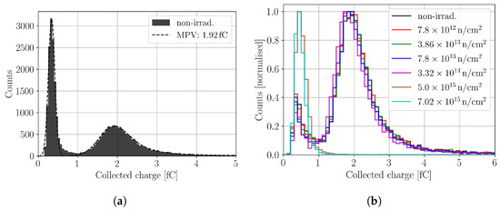 An example for the CC measurement in a non-irradiated device in shown in Figure 12a. It can be seen that the CC resembles the expected Landau–Gauss distribution, and an additional noise peak for charge is measured. The main part of the CC distribution is fitted with a Landau–Gauss distribution, and the noise peak is fitted by a Gaussian distribution [28]. The used fitting functions yield a satisfactory agreement with the data and allow to extract the most probable value (MPV) from the distribution, which corresponds to the generated charge of a minimum ionising particle (MIP). The MPV () needs to be corrected with the mean of the noise floor () to obtain the MIP charge. For a non-irradiated detector, the MPV is found as electron–hole pairs, which is in good agreement with expectations from the literature [29].