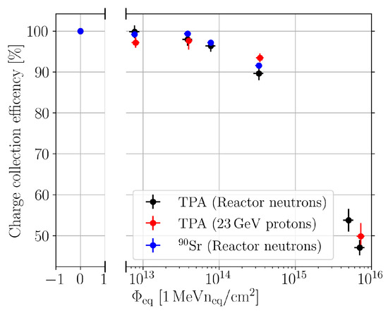 Besides the investigation of , it can be seen that the TPA-TCT provides CCE values even for fluences that are not accessible with the used 90Sr setup. This has two reasons: first, the intensity of the laser can be increased to much more than one MIP equivalent of charge, and second, averages for multiple acquisitions are available, as the charge generation of the laser is reproducible pulse-per-pulse. Both reasons significantly increase the SNR. In contrast, the 90Sr setup relies on single acquisition, because the charge generation is a stochastic process, and the events are uncorrelated. Further, the setup triggers on the coincidence of the two reference detectors, and in order to mitigate influences on the DUT’s signal acquisition, the DUT is not included in the trigger. Hence, it is not ensured that the DUT records a particle hit for every acquisition, which leads to the noise floor. In conclusion, it was demonstrated that the TPA-TCT allows for the performing of CCE measurements similar to a 90Sr setup. The TPA-TCT offers an extended measurement range. Moreover, the TPA-TCT allows us to study the CCE against the device depth, which was not shown here, because the aim of these measurements was to investigate the effects of radiation damage on , wherefore a study of a depth-dependent CCE was not presented, and the mean over the full device depth was used.