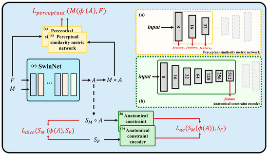 The acquired representations can be introduced into the registration model as prior knowledge. As shown in Figure 3b, the transformed anatomical segmentation and the fixed anatomical segmentation are input into the pretrained encoder, and the global similarity of the anatomical segmentation is evaluated by calculating the distance between the learned representations. We refer to the representations encoded by the anatomical constraint encoder as ACE(·). The formula is as follows: