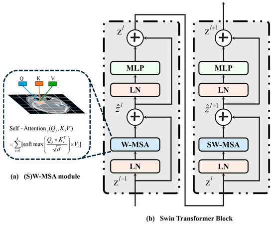 where and are the outputs of the (S)W-MSA module and the MLP module for the block, respectively. Following the self-attention mechanism [36], the attention operation is computed as follows: