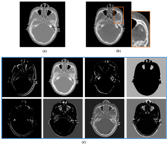 Figure 15 displays the multi-scale feature maps of CT and CBCT images that are extracted by the perceptual similarity metric network. The image shows that the CBCT image, which has lower quality, has severe artifacts that cannot identify the corresponding structures on the CT image. Consequently, this results in a decreased registration performance. Feature maps (b) and (c) demonstrate that the artifacts in the CBCT feature maps are less severe than those in the original image, and that, as the feature maps become deeper, there are fewer artifacts. This indicates that the pretrained convolution network can focus on the primary anatomical structure characteristics of the image and ignore the artifacts, effectively minimizing the impact of artifacts on the registration results. Moreover, computing the difference between the multi-scale CNN feature maps of multiple hidden layers can comprehensively evaluate the similarity between CT and CBCT images, and guide the learning process to accurately align the two images.