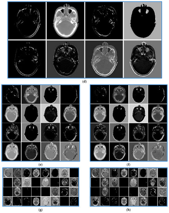 Slice examples of CT and CBCT feature maps at different scales. (a,b) The original image slices of CT and CBCT, respectively. (c–h) The feature maps at different resolution levels produced by the first three layers, with the resolution halved after each layer. Specifically, (c,e,g) are feature maps of CT images, while (d,f,h) are feature maps of CBCT images.