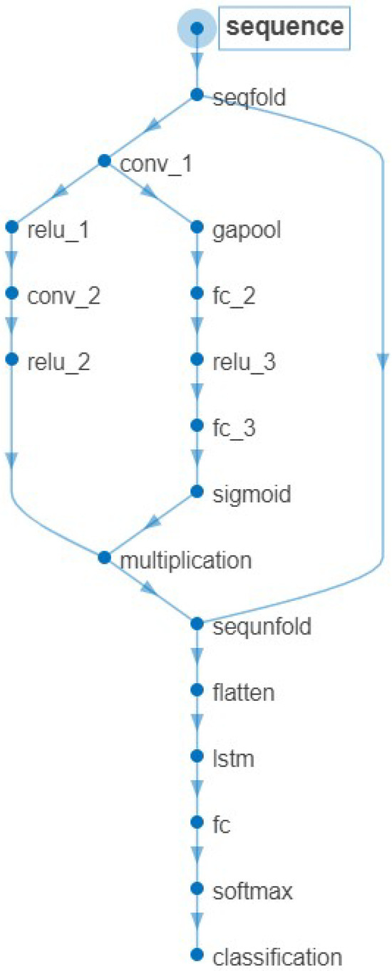 As shown in Figure 5, the values of PCANet are fed into parallel 1D CNN networks, i.e., Stream A and Stream B. The parallel outputs of CNN streams will be multiplied based on the element. After unfolding and flattening, the multiplied sequence will be the input of a bidirectional LSTM (BiLSTM) structure. The BiLSTM structure includes two LSTM networks. The first LSTM network is for forward learning from the previous values, while the second LSTM network is for inverse learning from the upcoming values. The learned information will be combined in the attention layer. The attention layer has four hidden fully connected layers and a softmax, which is used to merge the upstream layer’s output and filter the significant representations out for recognition purposes, i.e., the fusion feature of the inputs. The pseudocode for computing CNN-BiLSTM with K-fold cross-validation is shown in Algorithm 2, and its options are listed in Table 1.The usage of trainNetwork is shown in Figure 6, and its analysis is listed in Table 2.