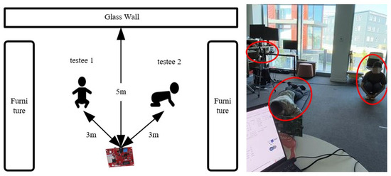 For the experimental setting, an activity room (6 m × 8 m) within the Doctoral Building of the University of Glasgow was chosen to support ample ground for our experiments. The distances between the testee (1.5 m), glass wall, and AWR2243 are shown in Figure 8. The radar resolution of the azimuth and elevation were and , respectively. In the experiment, the azimuth angle was mainly concerned with the moving testee. Therefore, the angular separation should range from to , which can resolve the two subjects spatially. The horizontal and vertical radar fields of view (FoVs) are both , giving the radar FoV a concical shape. In our experiments, all testing subjects were within the radar’s FoV. However, if additional targets are present outside the FoV, they may appear as ‘ghost’ targets in the radar spectrogram. The further these targets are from the radar’s FoV, the lower their signal-to-noise ratio (SNR) will be.
