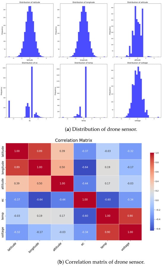 In addition, we show the distribution characteristics of each variable through the histogram and show the range and frequency of sensor readings as shown in Figure 3a. These histograms are used to visually compare the quality of the synthetic data generated by our generated model in the subsequent performance evaluation section. There is a previous study showing that the transformer-based generation model, which is widely used, including ChatGPT, is suitable for datasets with Zipfian distribution and burstiness characteristics [43]. However, the histogram like the figure shows that the data from our study do not have Zipfian distribution and burstiness characteristics. Therefore, we propose a generation technique using GAN based on previous studies related to multivariate time series data. We also use correlation matrices such as Figure 3b to identify positive correlations, negative correlations, and correlation strengths to highlight the relationships between different variables. The correlation matrix in Figure 3b is calculated using Pearson correlation coefficients, which quantify the linear relationships between pairs of variables by dividing the covariance of the variables by the product of standard deviations. This provides a comprehensive view of how each pair of variables interacts, with values from −1 representing perfect negative correlations to 1 representing perfect positive correlations and 0 indicating no linear correlation. Through this, we propose an attention mechanism focusing on correlation variables to seamlessly learn and generate realistic synthetic time-series sensor data. We intend to resolve the lack of data in drone operation by generating synthetic time-series sensor data and contribute to the advancement of autonomous drone systems by improving data generation techniques.