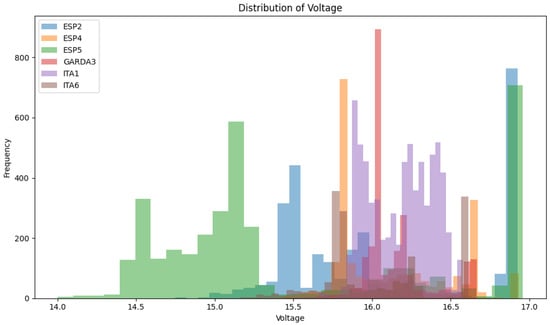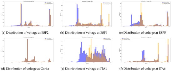 The dataset contains various parameters recorded during drone operation, such as date_time, latitude, longitude, altitude, EC, temp, DO, voltage, m0_current, m1_current, and heading. Latitude and longitude represent drone location information that is important to ensure diversity of flight paths, elevation represents drone height is important to obtain data at different altitudes, EC reflects the characteristics of the surrounding environment, temperature changes during a flight can affect drone performance, dissolved oxygen (DO) represents certain environmental conditions, voltage represents the power state of the drone that is critical to battery performance, m0_current, and m1_current represent the current usage of the drone motor, reflect the operational state, and heading shows the direction of the flight of drone, which is essential for generating different flight patterns. At this time, latitude, longitude, altitude, EC, temp, DO, voltage, and heading are important factors in drone operation. For instance, the detailed distribution of voltage data variables in each region used in our study is shown in Figure 5. Given the strong correlation between voltage and temperature, our attention mechanism addresses the rapidly changing latitude, longitude, altitude, and inverse correlation with EC while focusing on this relationship. Through this approach, we proceed with the generation of synthetic voltage data and evaluate the quality of the data.
